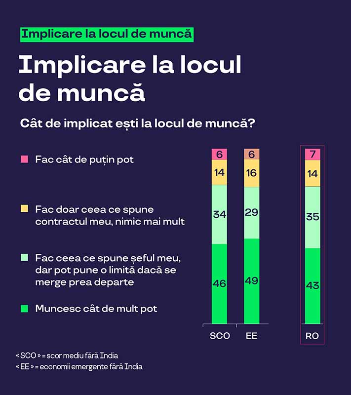 Contrar convingerilor comune, implicarea la locul de muncă rămâne puternică. Aproape jumătate dintre angajați (46%) spun că depun tot efortul posibil la locul de muncă. Totuși, 34% adoptă o abordare mai echilibrată, îndeplinind așteptările, dar stabilind limite atunci când este necesar. Jean-Baptiste Barféty numește această atitudine „Implicare Echilibrată.”
