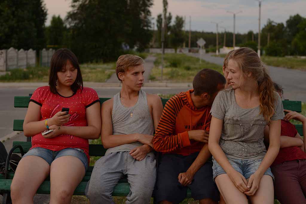 Câţiva adulţi tineri din Chtchastia, un oraş din regiunea Donbass, stau pe o bancă şi vorbesc. © Marion Péhée